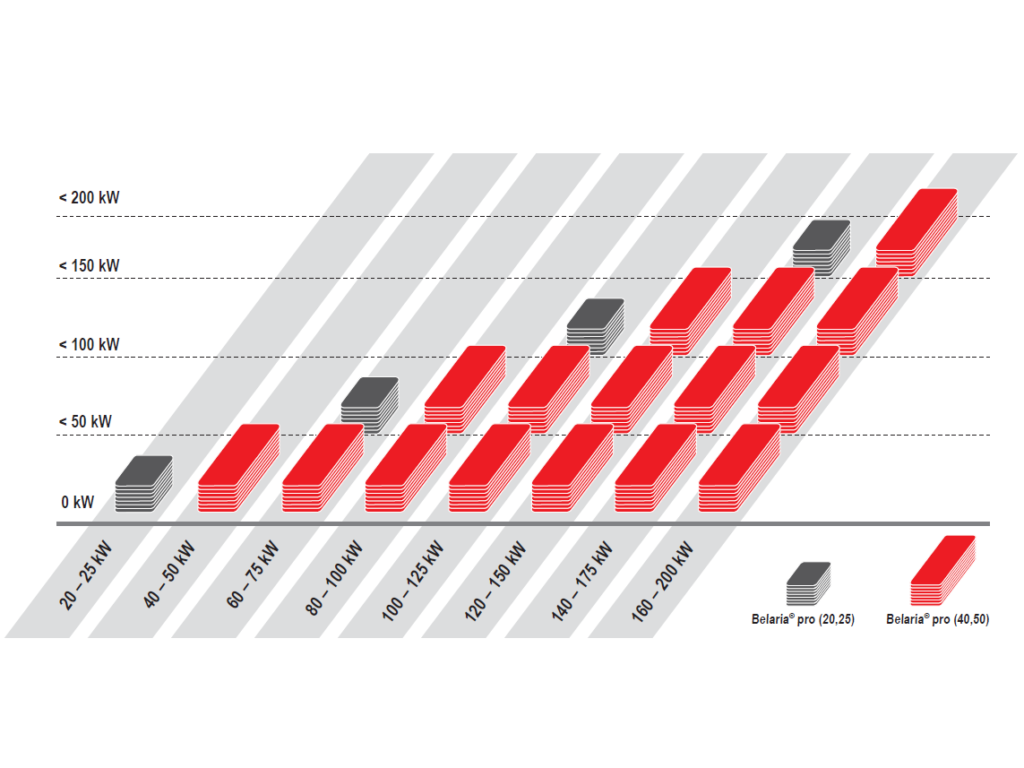 Din punct de vedere al performanței, Belaria pro furnizează exact puterea necesară, datorită tehnologiei cu inverter modulant și posibilității de configurare în cascadă. Cele patru trepte de putere disponibile – 20, 25, 40 și 50 kW – permit obținerea unor puteri totale fin gradate, adaptate fiecărui proiect. Această ajustare precisă asigură o eficiență ridicată atât în regim de încălzire, cât și de răcire, contribuind direct la reducerea costurilor de exploatare.