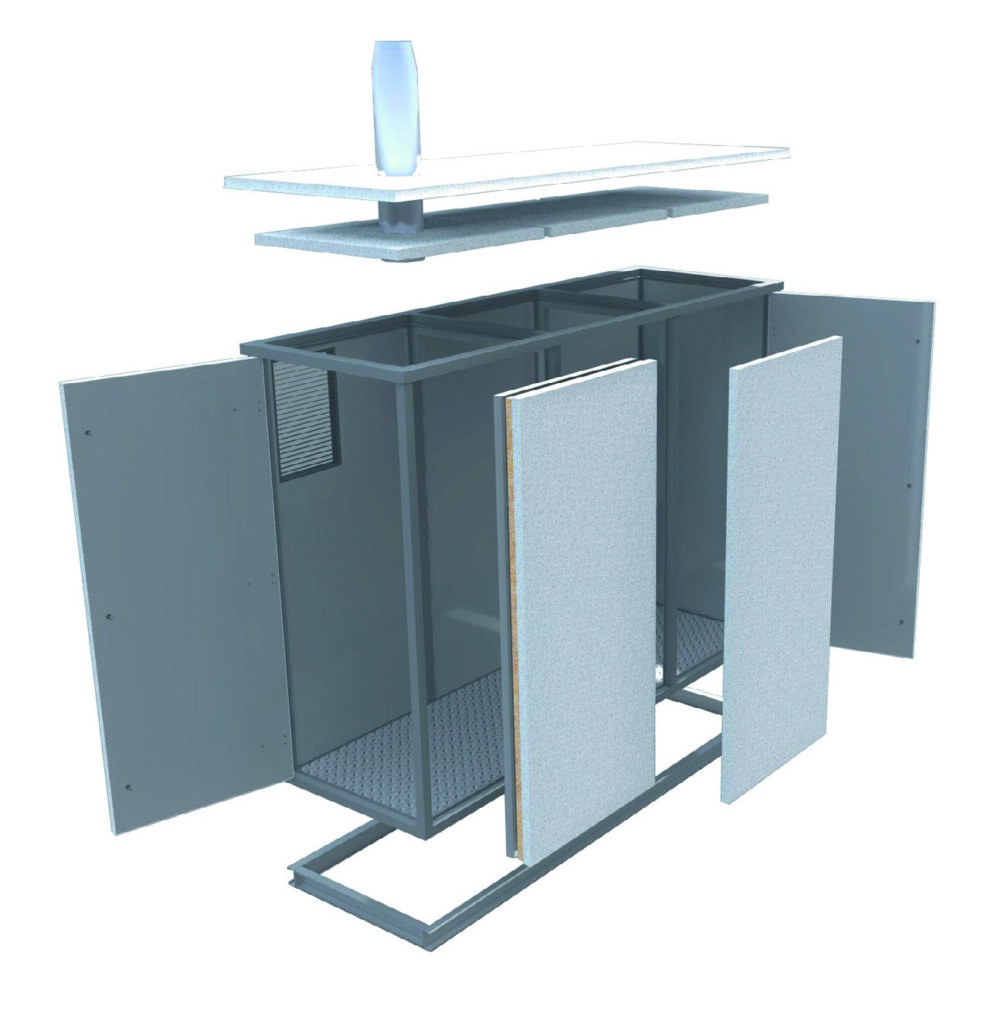 Construcția modulului Cabin Slim este gândită pentru durabilitate și siguranță în exploatare. Pentru a asigura etanșeitate și protecție împotriva condițiilor meteorologice, modulul este realizat din tablă galvanizată vopsită, disponibilă standard în alb sau în culoarea solicitată de client. Panourile perimetrale sunt izolate cu vată bazaltică ignifugă, ceea ce oferă o izolare termică eficientă și contribuie la menținerea energiei termice în interior, reducând pierderile.