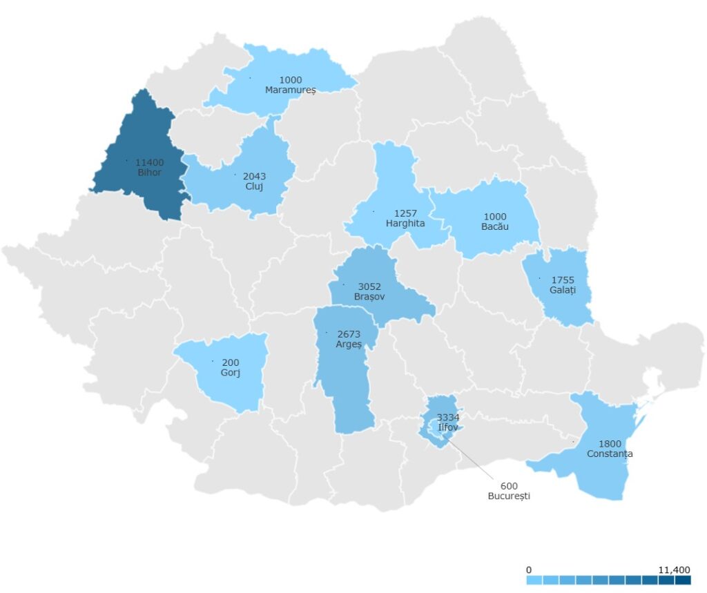 Județul Bihor se detașează clar din punct de vedere al suprafeței și al valorii investițiilor. Cu aproximativ 11.400 mp monitorizați, acesta concentrează cea mai mare parte a proiectelor logistice din perioada analizată. Mai mult, Bihor este și singurul județ cu un proiect major aflat în prezent în autorizare, cu o valoare estimată la 185 milioane de lei și o suprafață de 11.000 mp. Acest indicator sugerează un potențial ridicat de livrări noi începând cu 2026, susținut de poziționarea strategică a Oradei, proximitatea față de granița cu Ungaria și integrarea în coridoarele europene de transport.